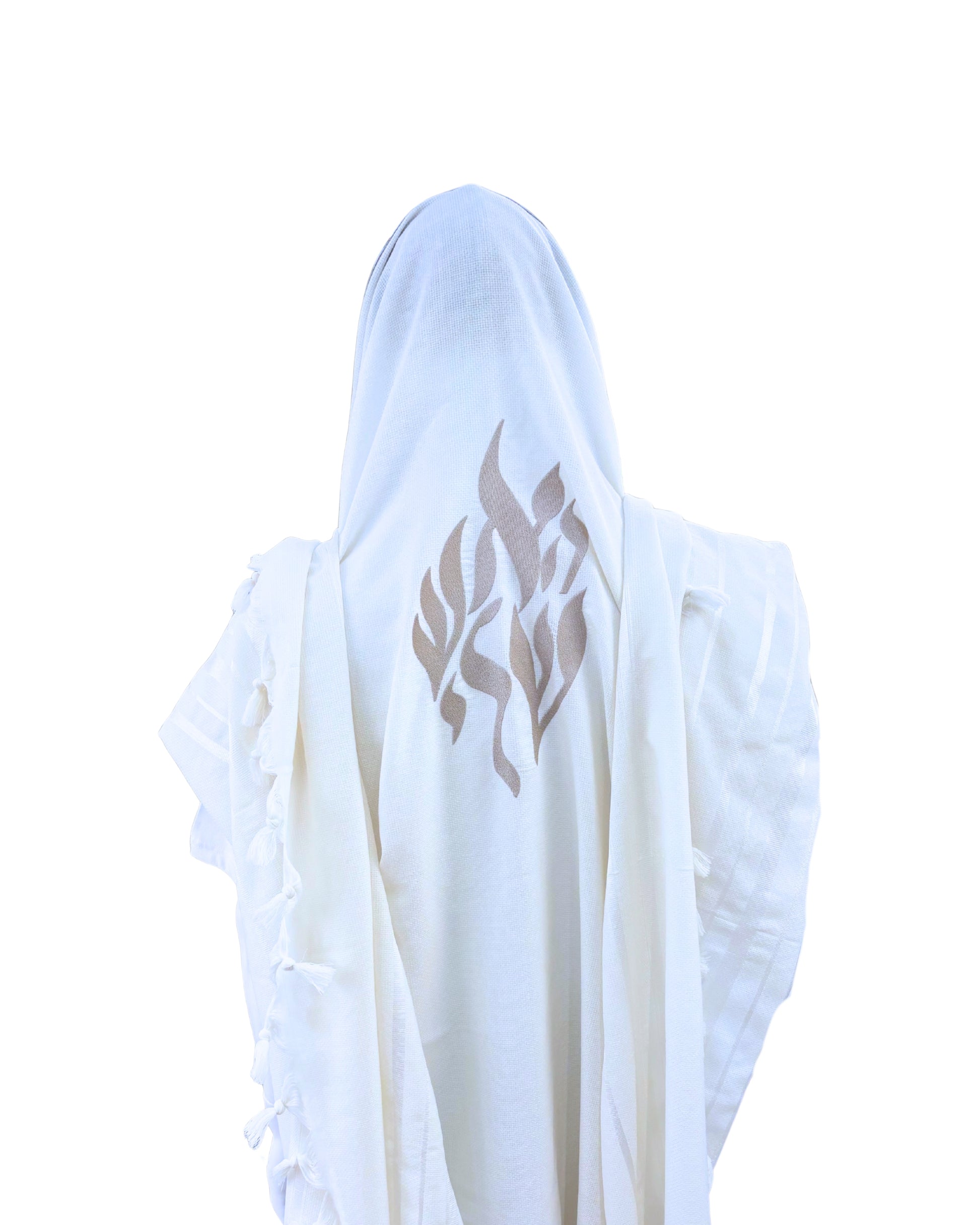 Col (atarah) : Inscription « Na Nah Nahma Nahman Meouman » le chant nouveau révélé par le Petek envoyé par Rabbi Nahman à Rabbi Israel Dov Odesser. Lettres brodées sur un col beige effet jean