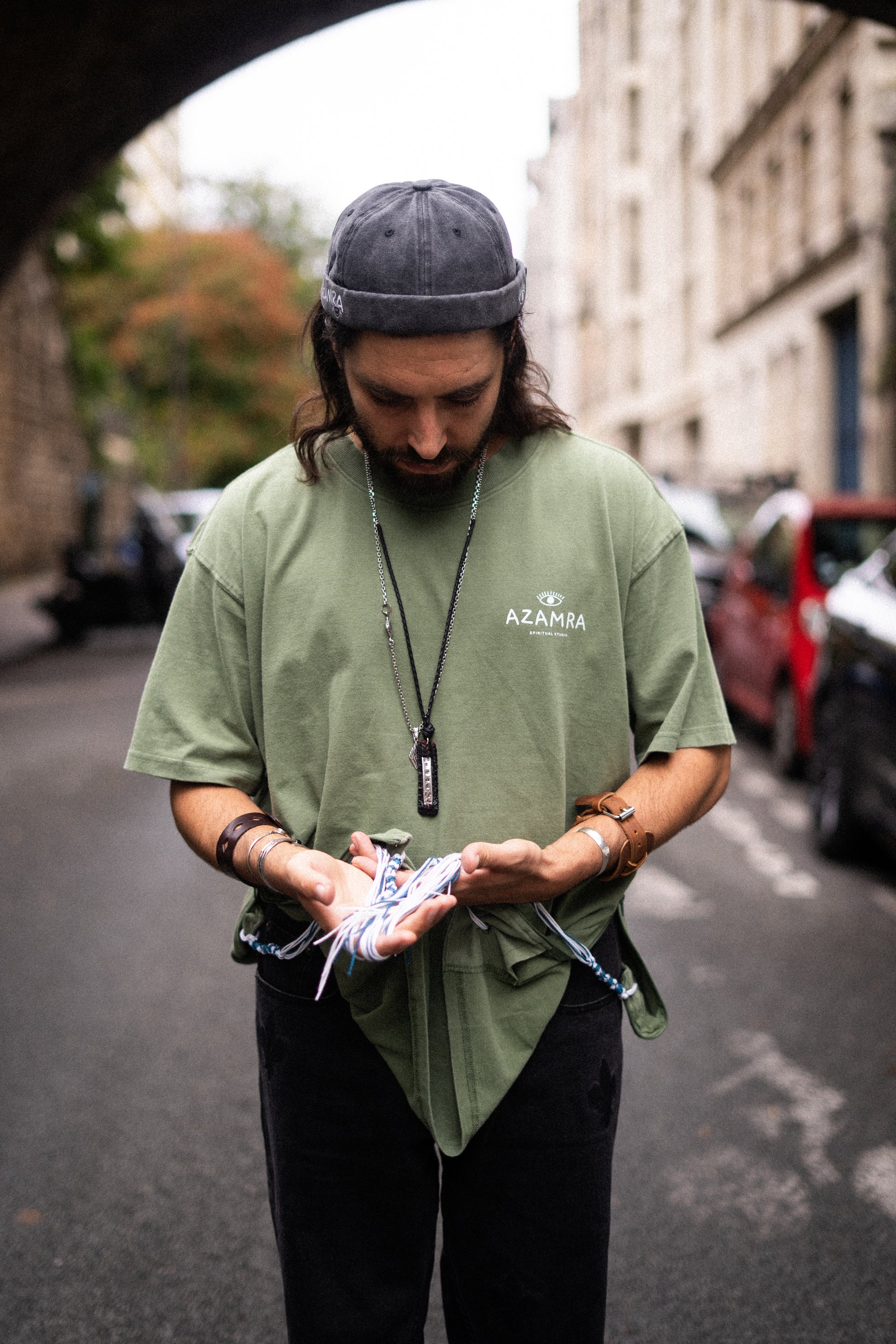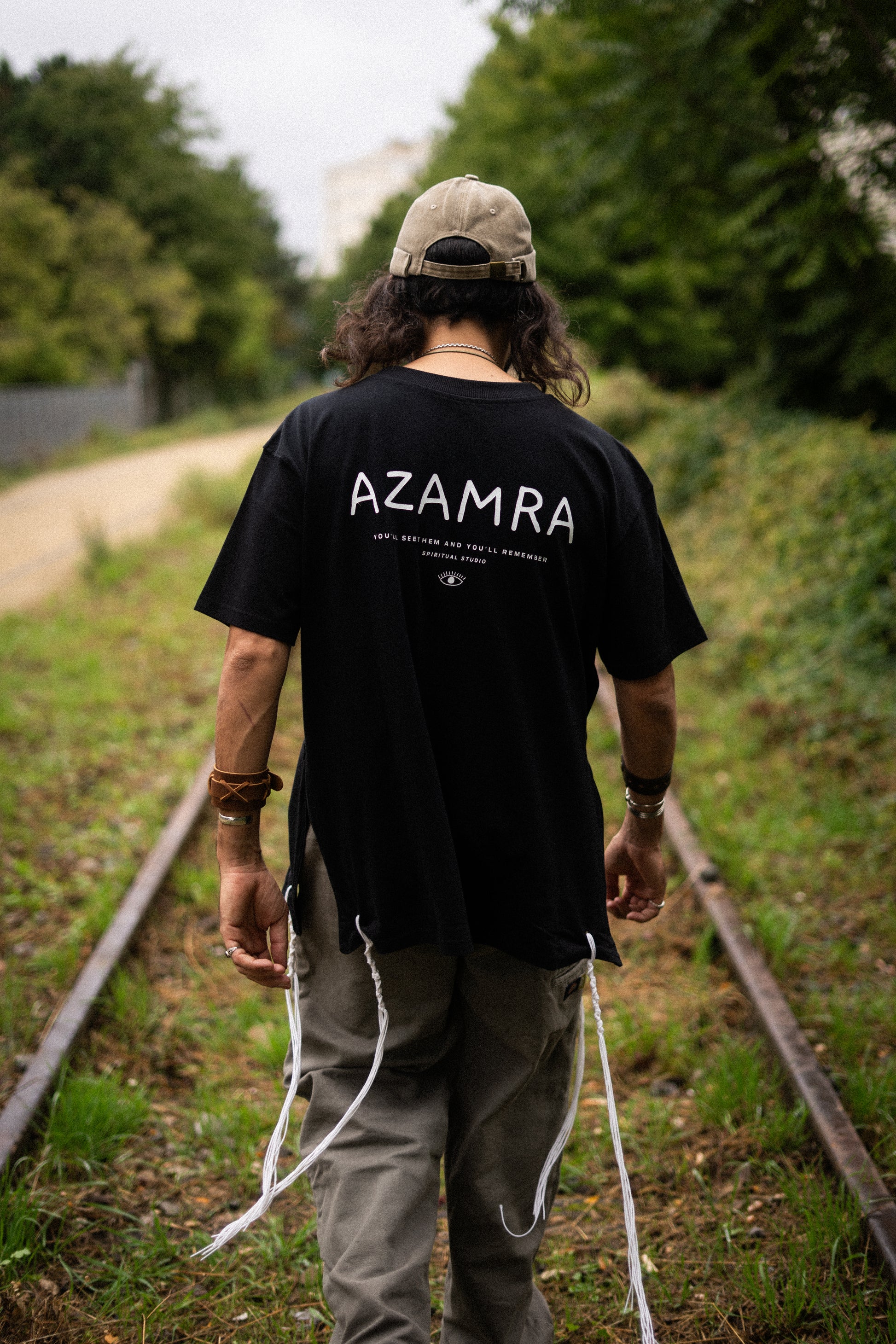 Logo Azamra côté cœur + grand logo dans le dos avec l'inscription "you’ll see them and you’ll remember", cela fait référence au 3e paragraphe du Chéma Israel où l'Eternel dit à Moché que les enfants d'Israel, en regardant les Tsitsit, se souviendront de Ses commandements.